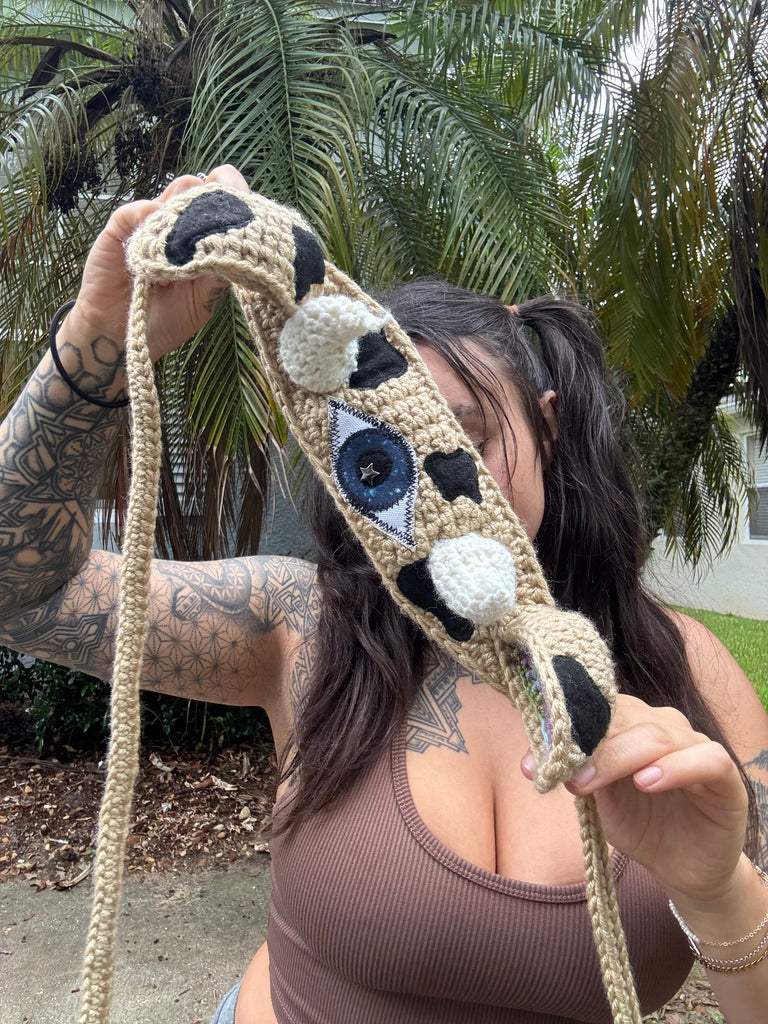 ✨ crocheted creature headband with long thick ties for an adjustable fit!