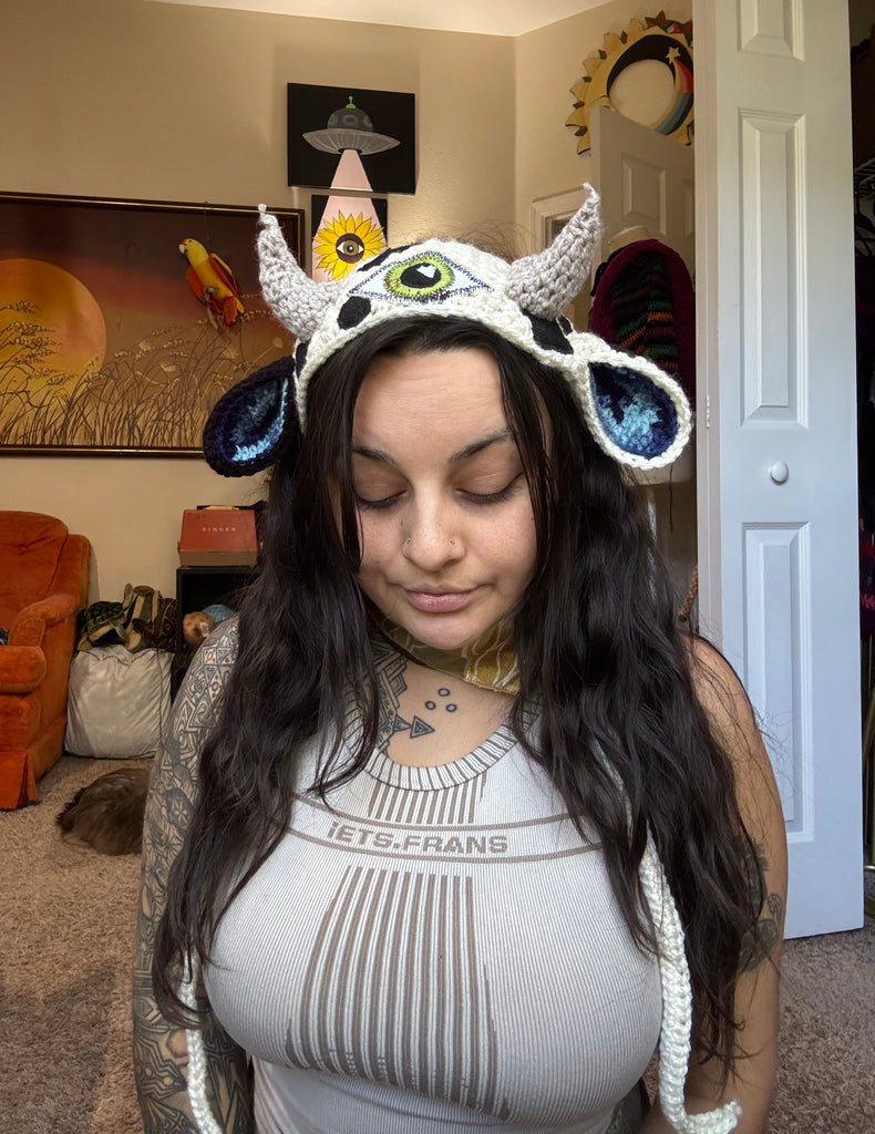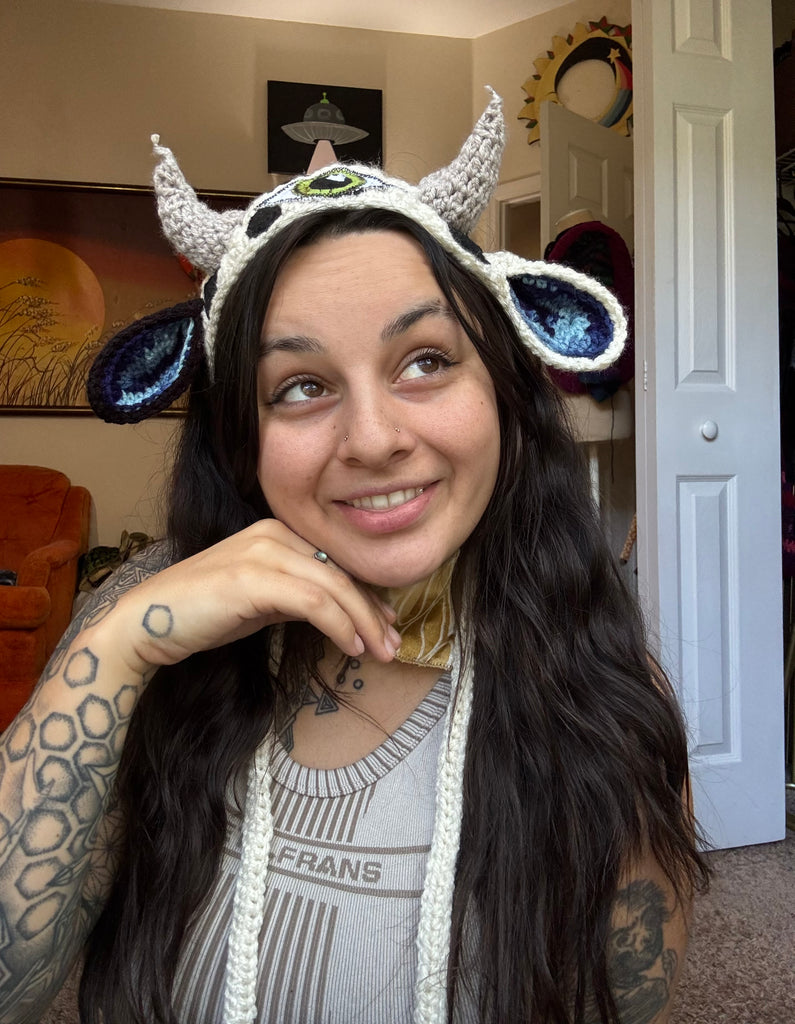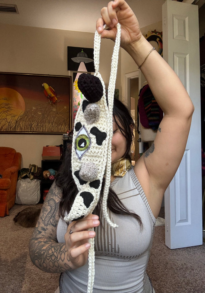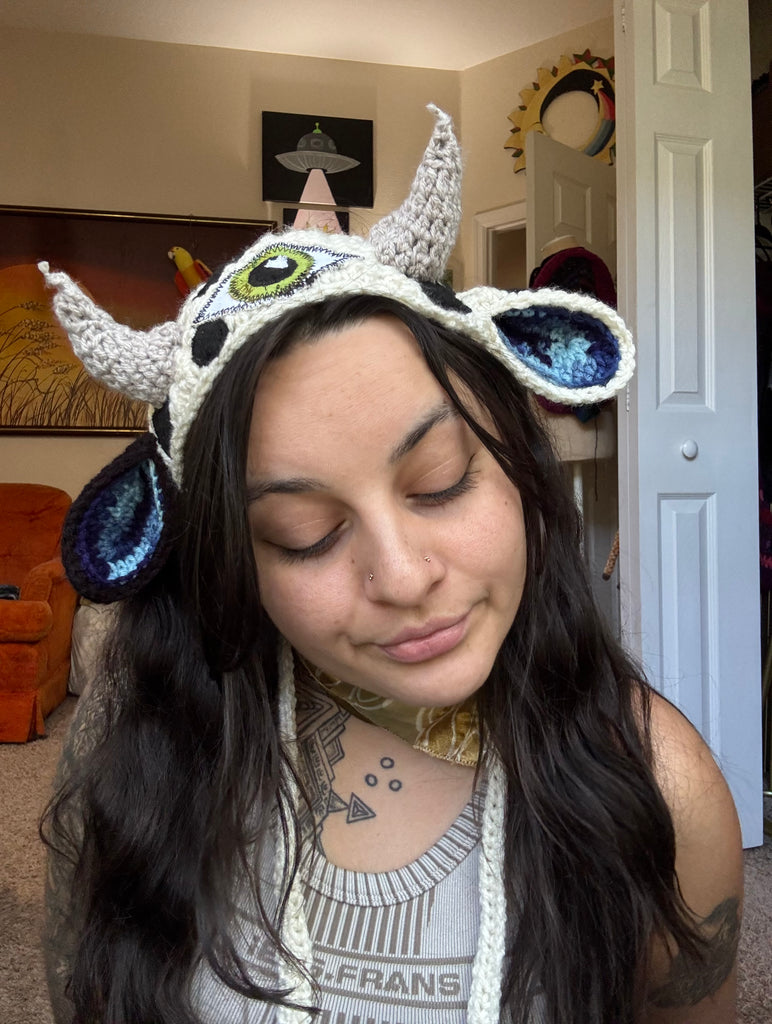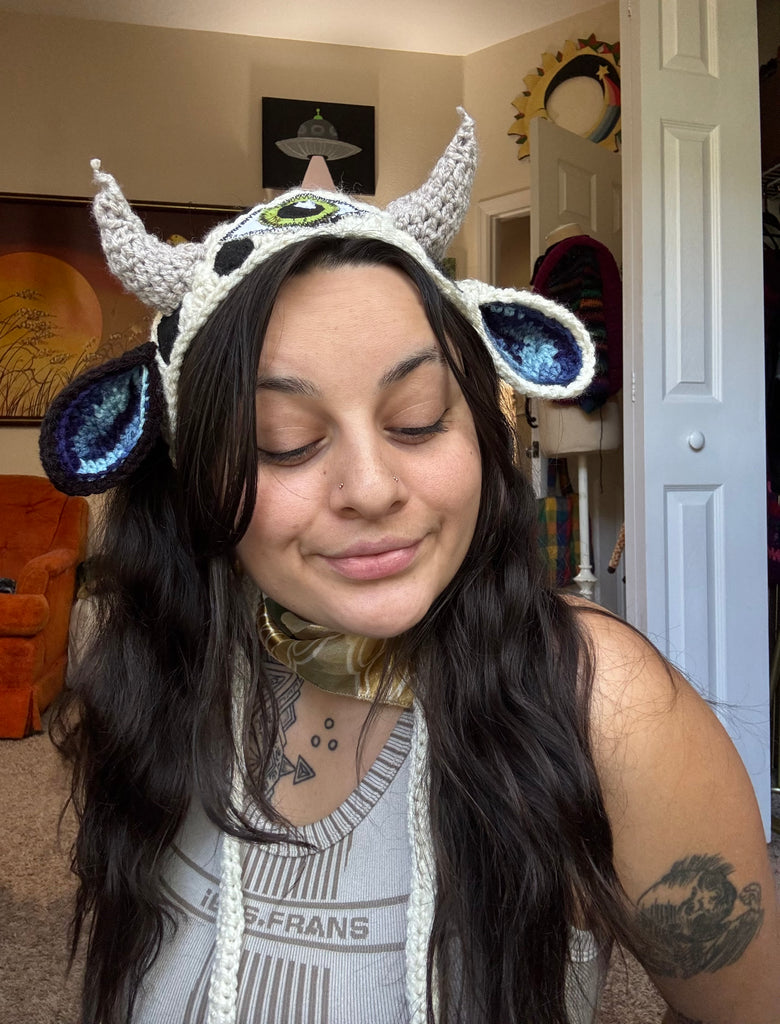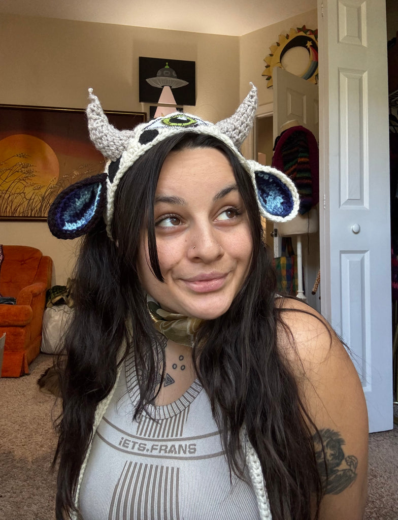 ✨ crocheted creature headband with long thick ties for an adjustable fit!