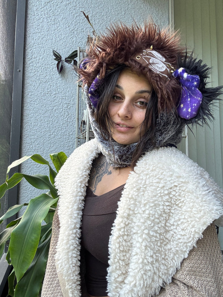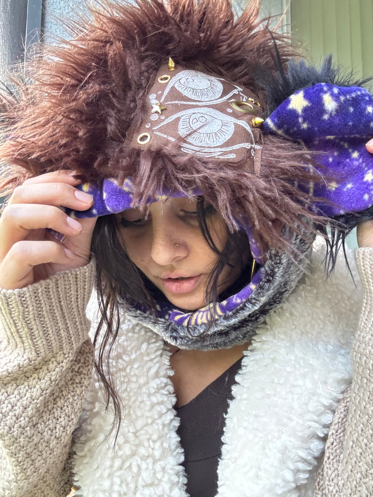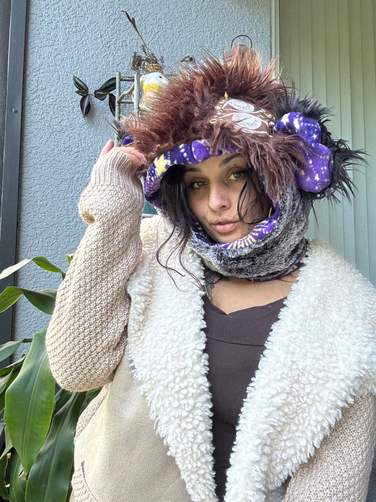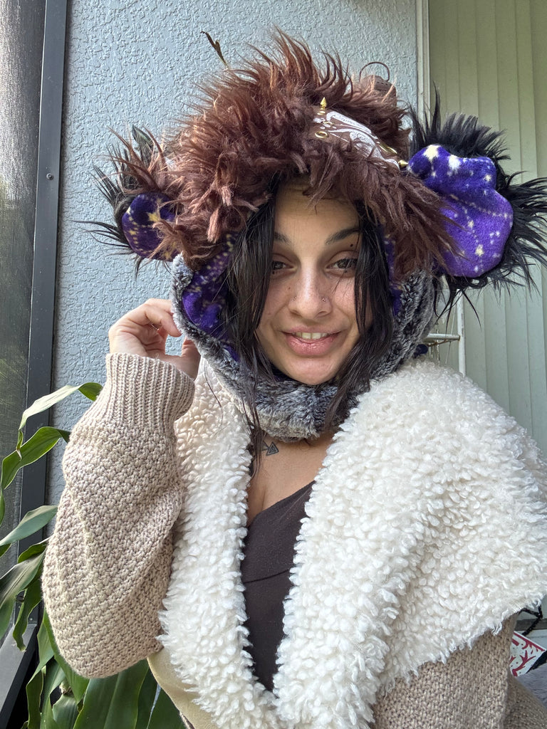 Patchwork faux fur hood hat~ fully lined with a celestially print fleece