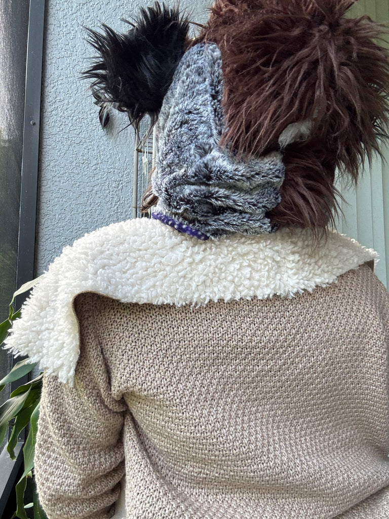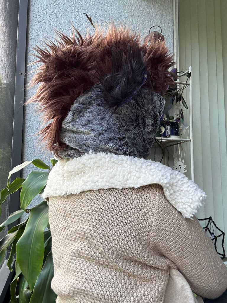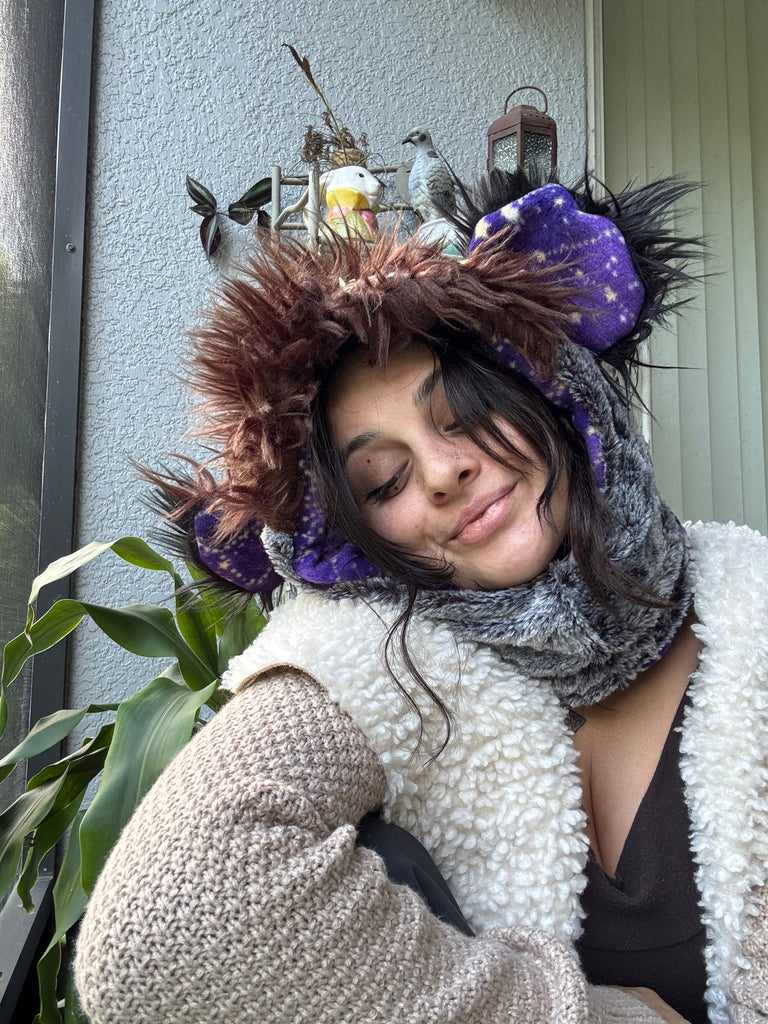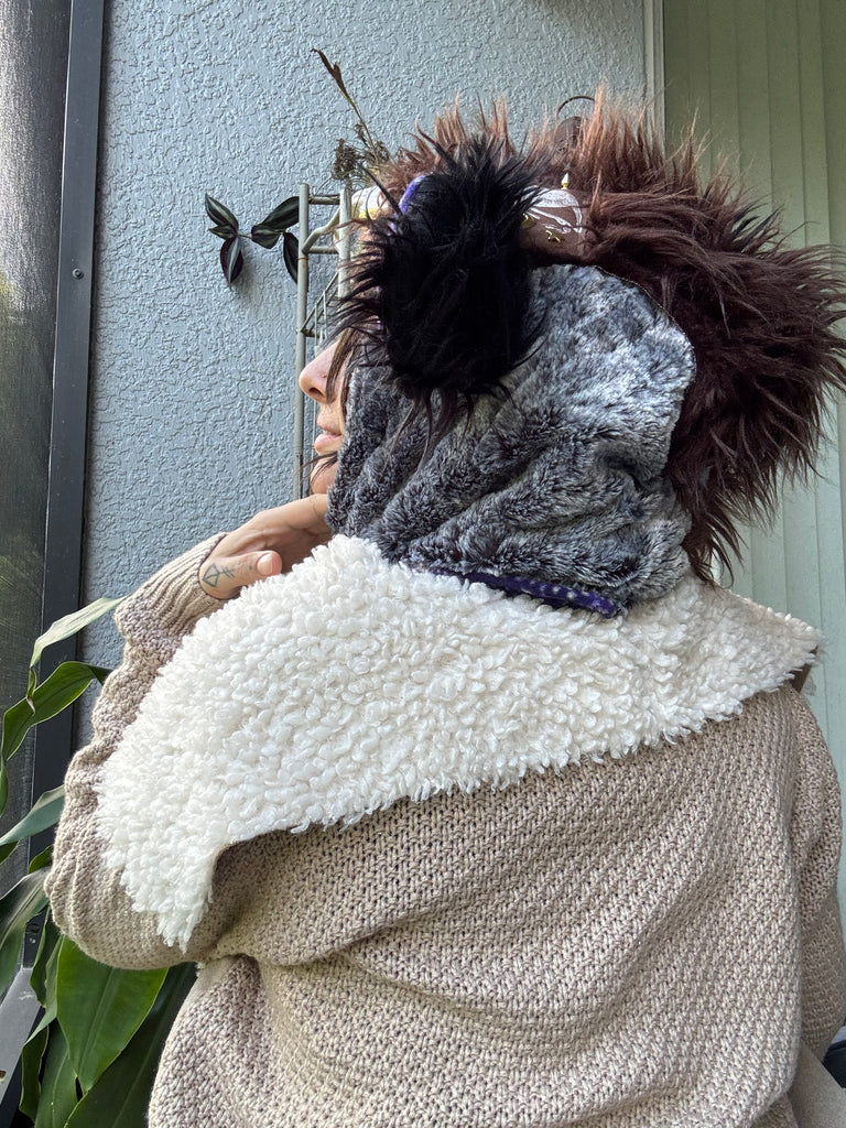 Patchwork faux fur hood hat~ fully lined with a celestially print fleece