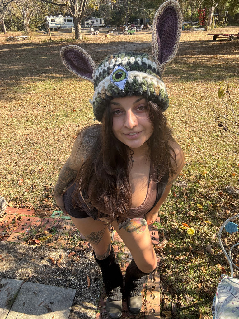 Acrylic blend and wool rolled brim beanie hat with a 3rd eye star studded patch and floppy bunny ears