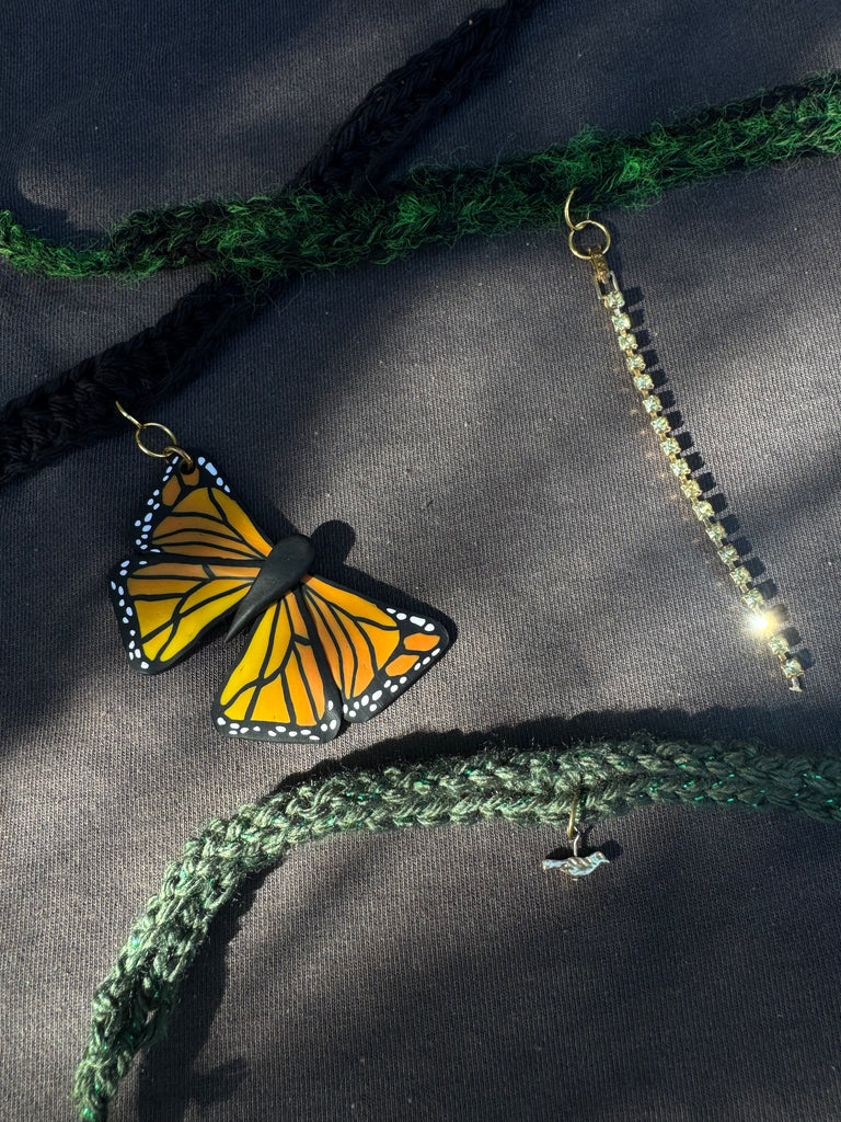 Made from scrap yarns and repurposed/salvaged jewelry and shiny bits I’ve collected over the years!