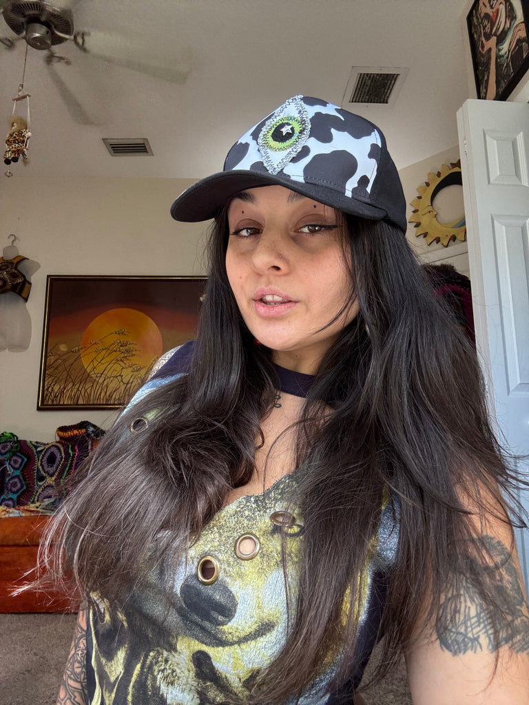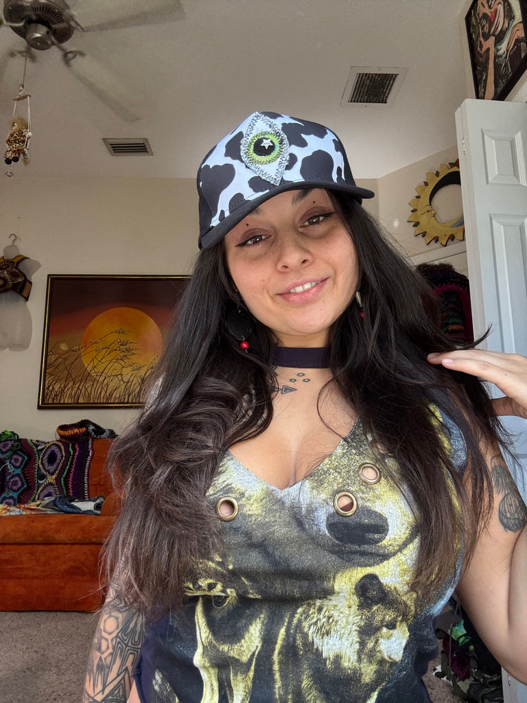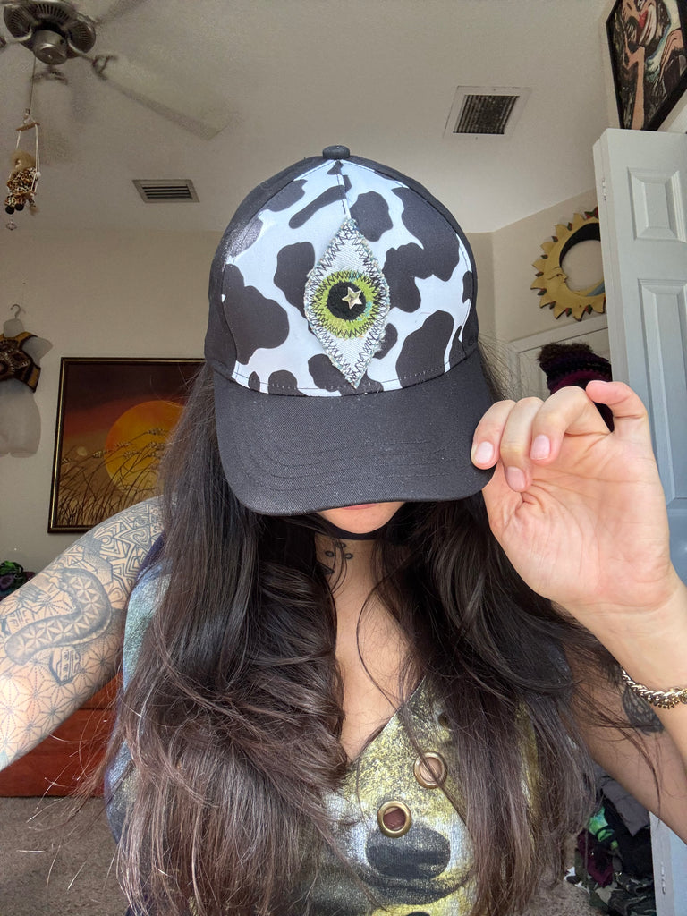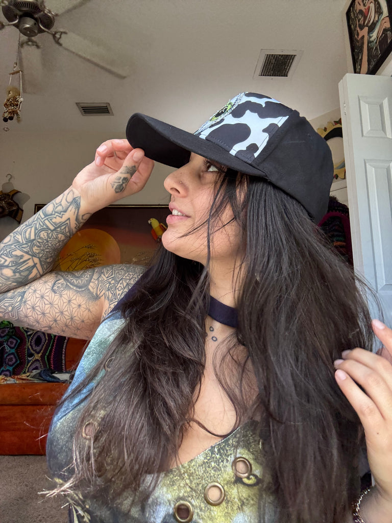 Black and Cow Print brimmed hat with plastic snap adjustable strap