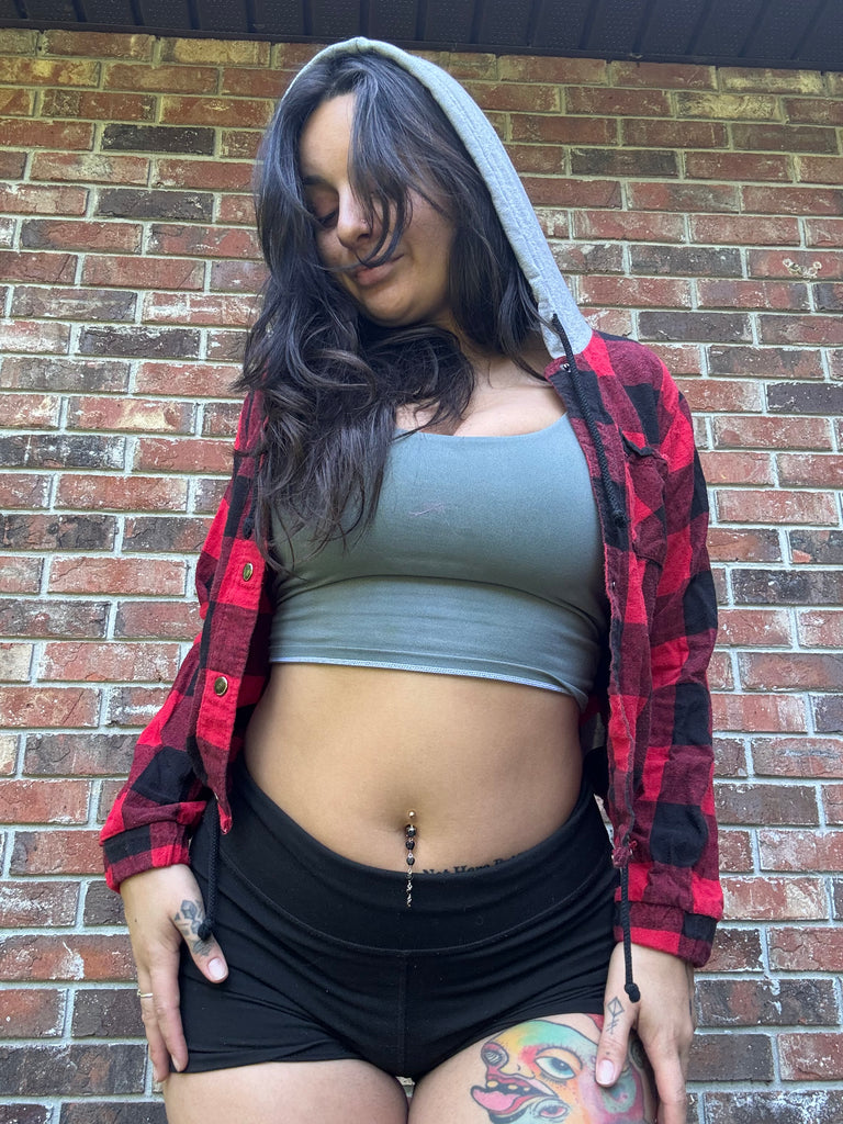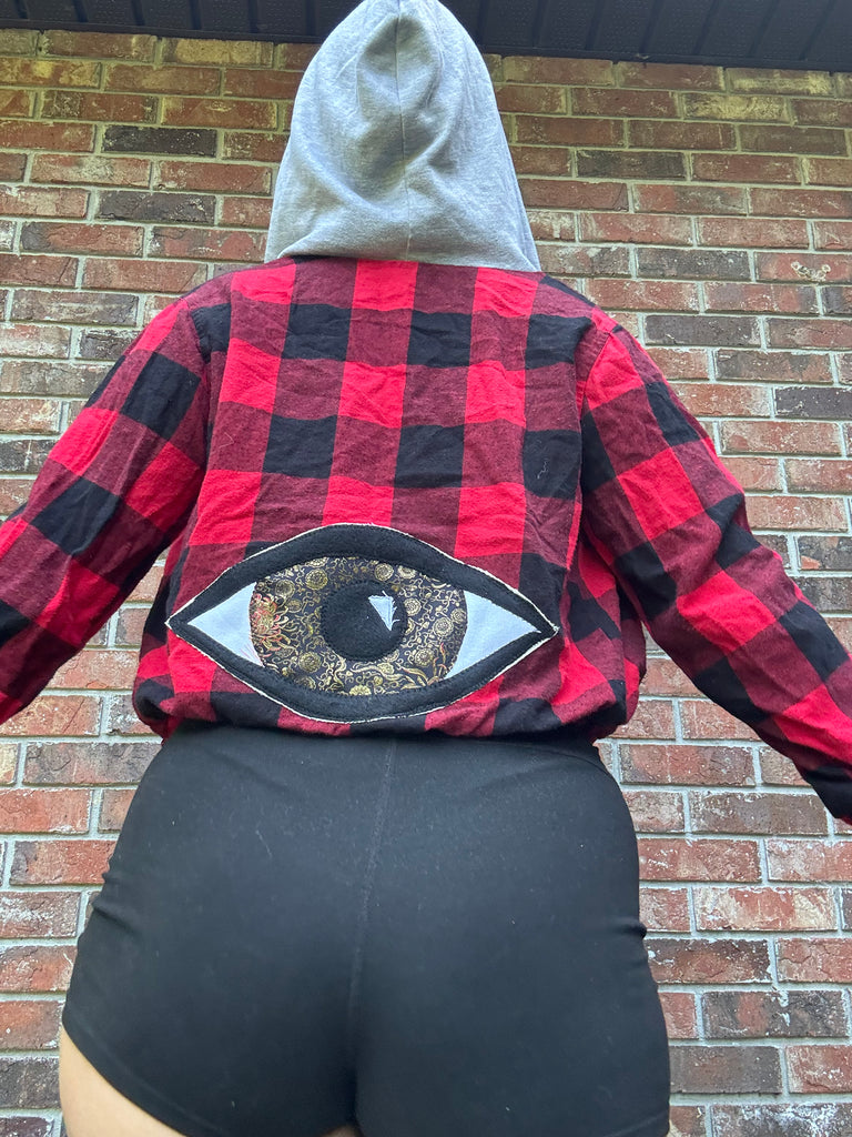 Upcycled flannel crop hoodie with hood and snap closures! Features a large eyeball patch on the back!