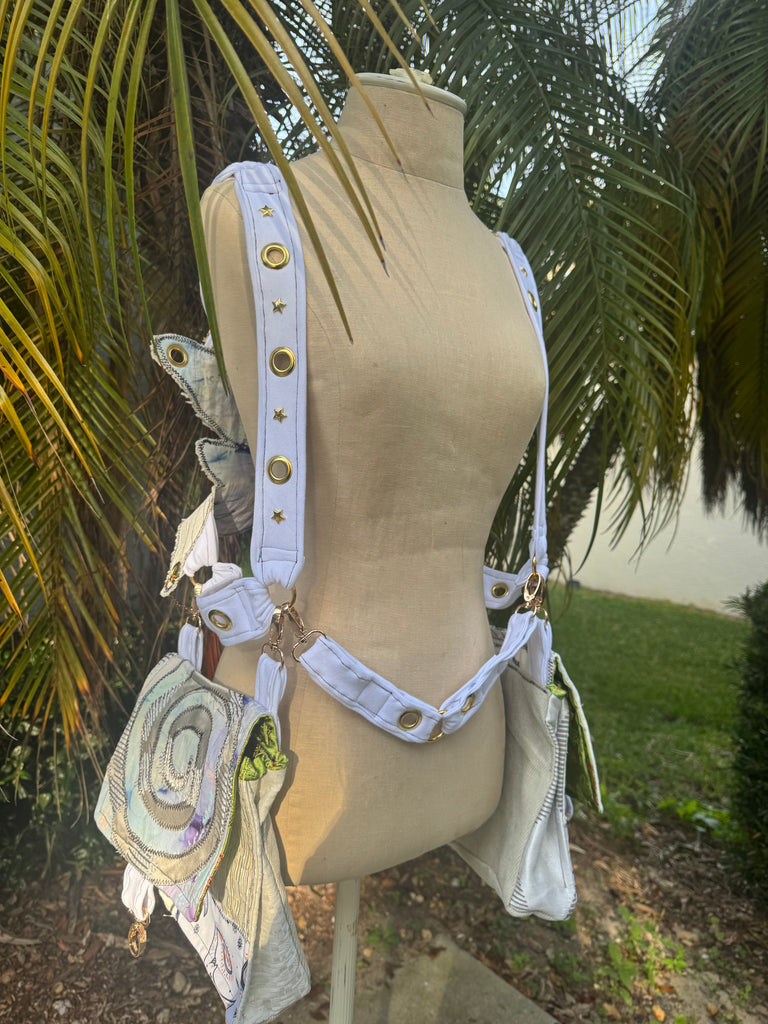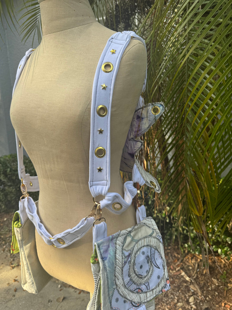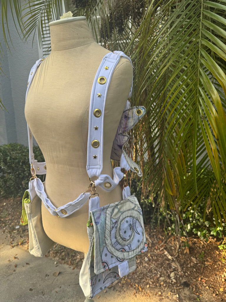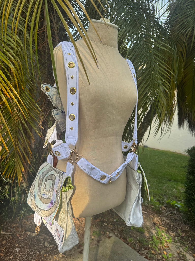 Introducing the FLY HIGH HOLSTER - where functionality meets fashion. This unique shoulder holster features stunning butterfly wings, intricate embellished details and modular cargo pockets for hands-free convenience. These Pockets are fully lined as well as the back of the wings for top to bottom celestial luxury. Remove the pockets or clip on just one for multiple different styles with just one piece! There is a front clip on strap for an extra secure and optional closure. Elevate your style and stay organized with this functional work of art.