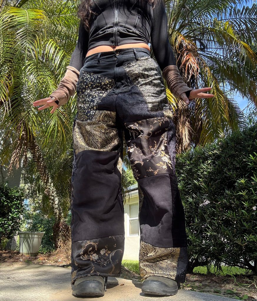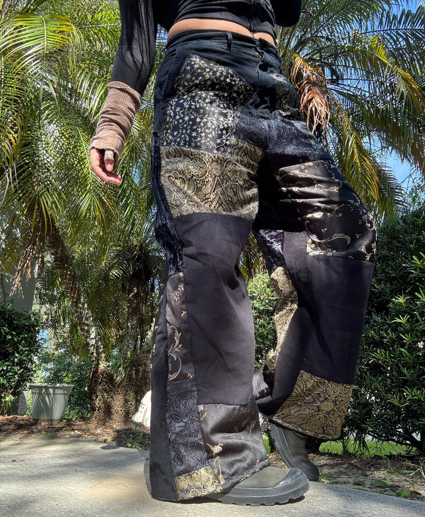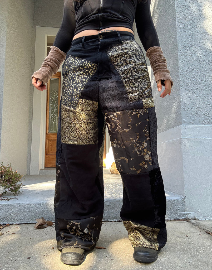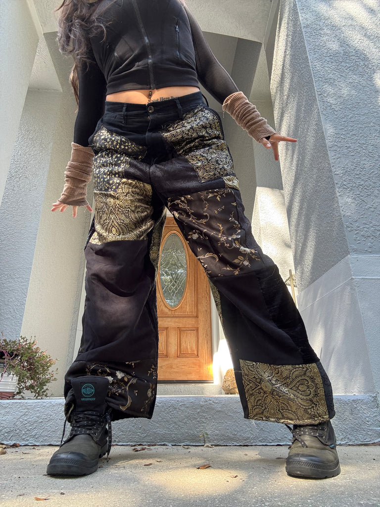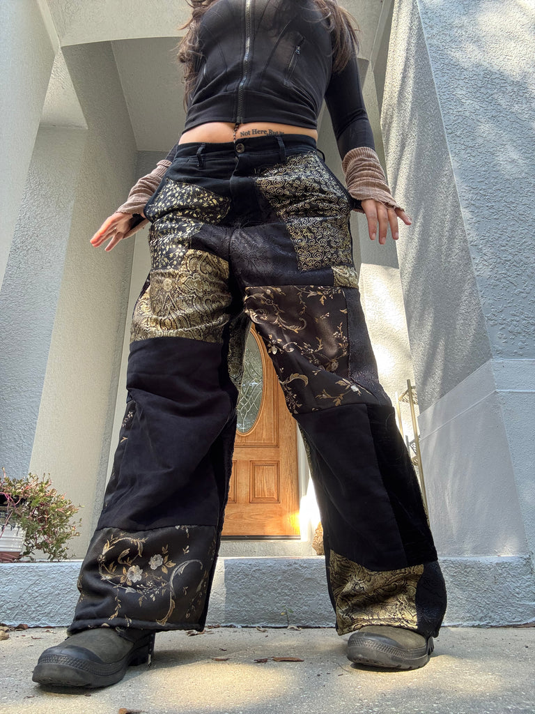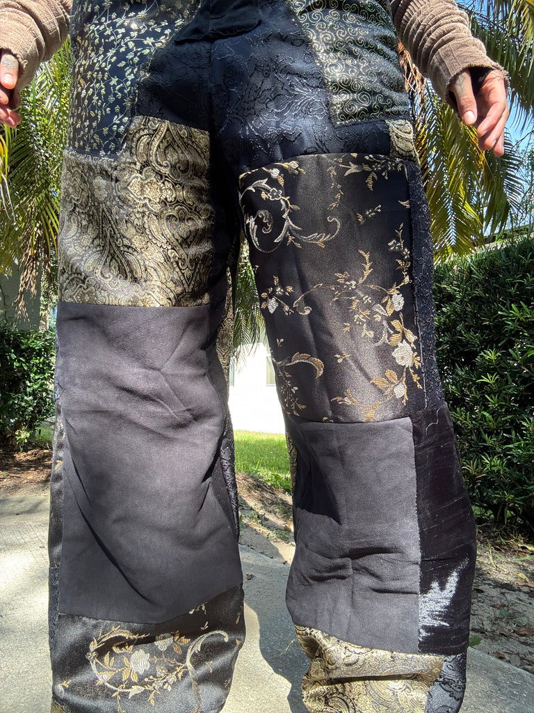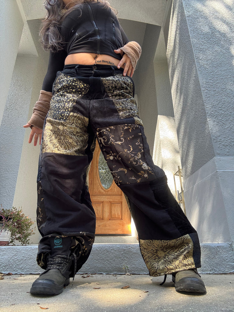 Gorgeous patchwork shimmery pants made from upcycled and thrifted materials Pants are lined with black corduroy and feature button and zipper closure~