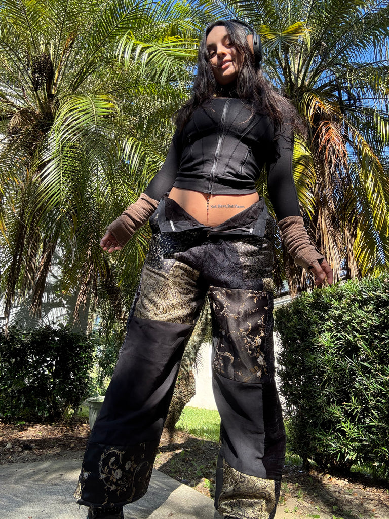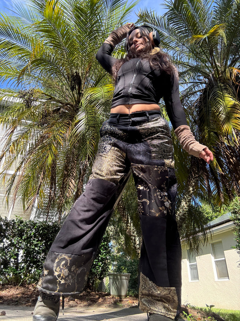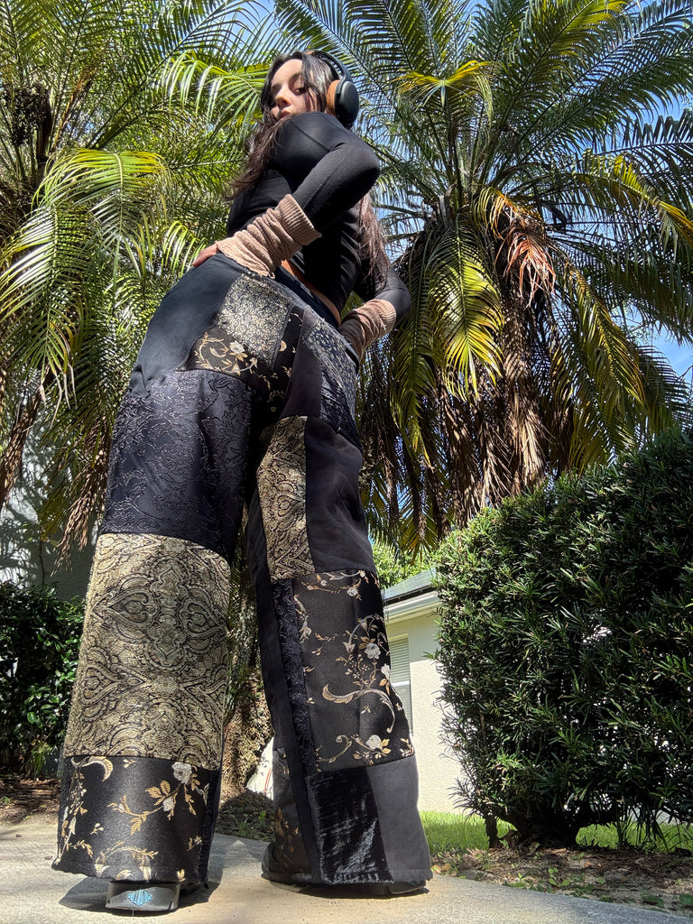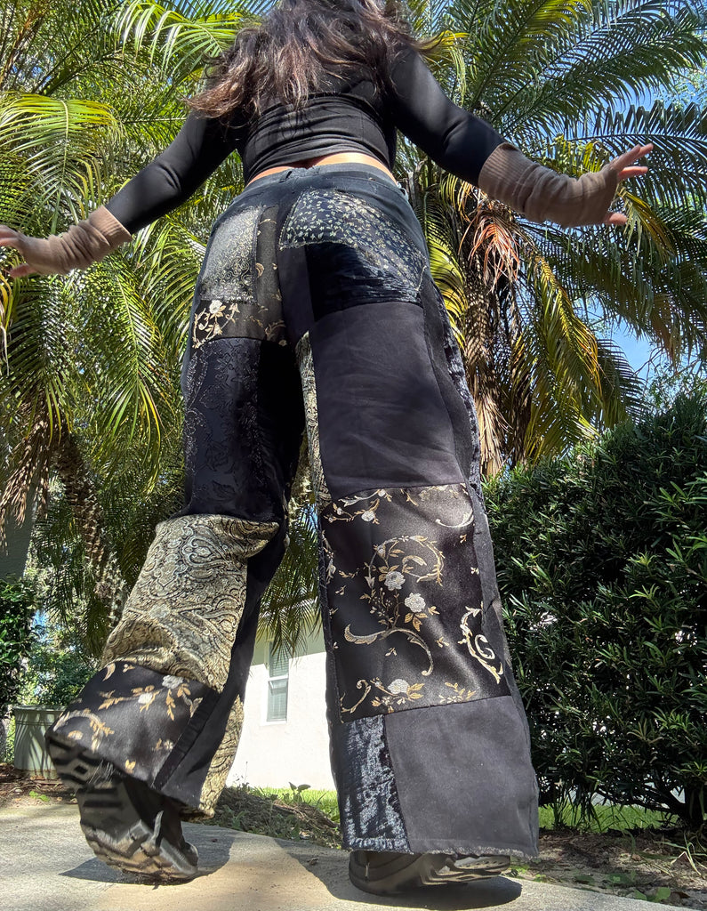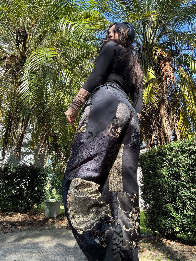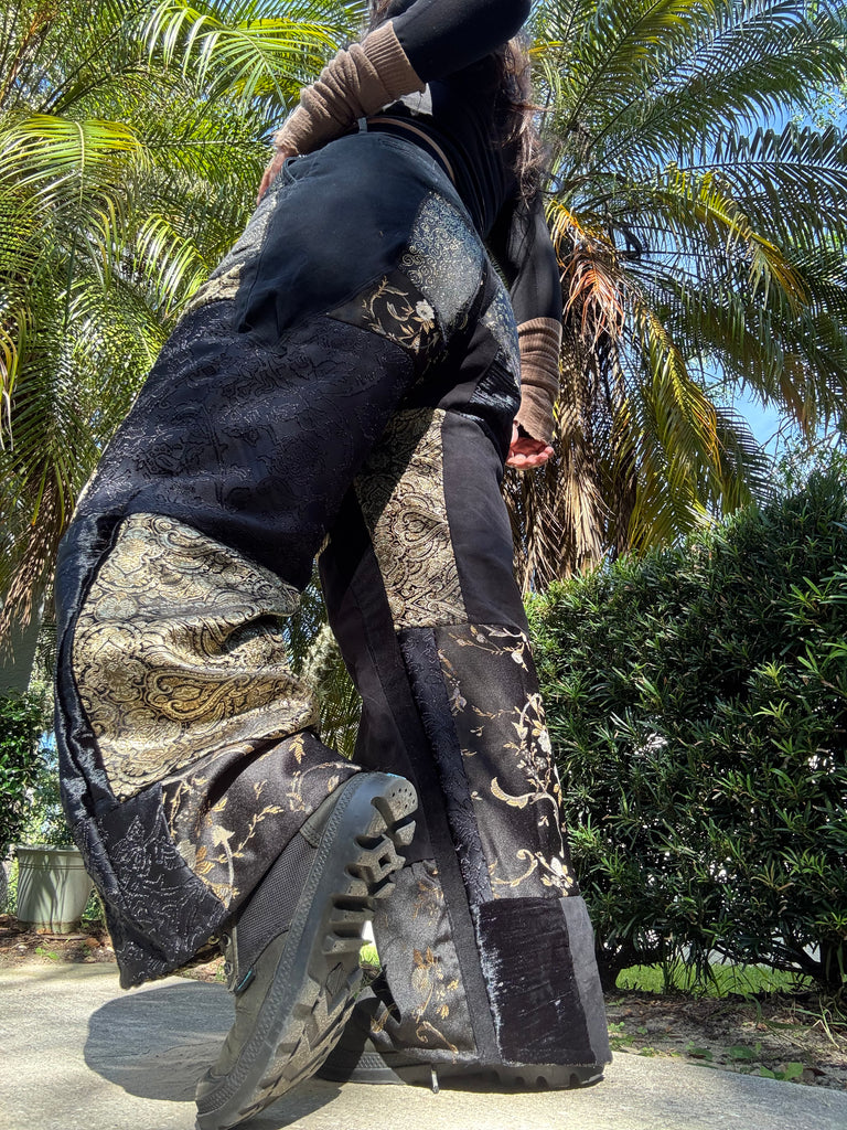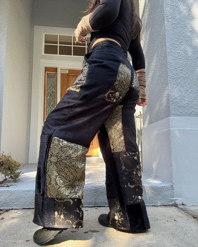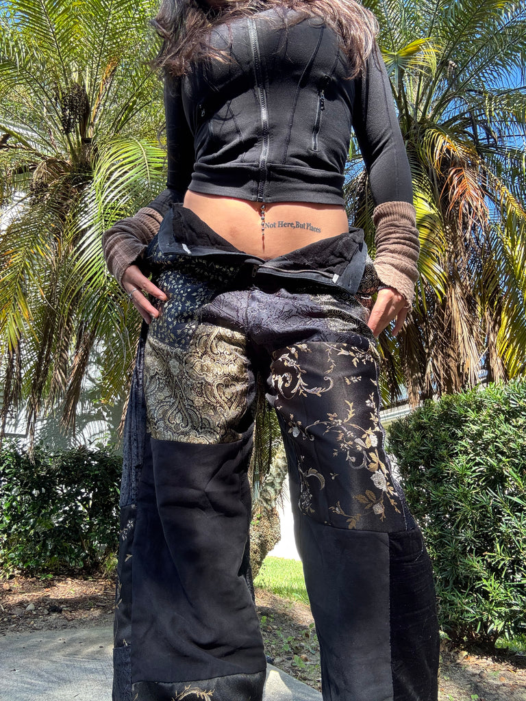 Gorgeous patchwork shimmery pants made from upcycled and thrifted materials Pants are lined with black corduroy and feature button and zipper closure~