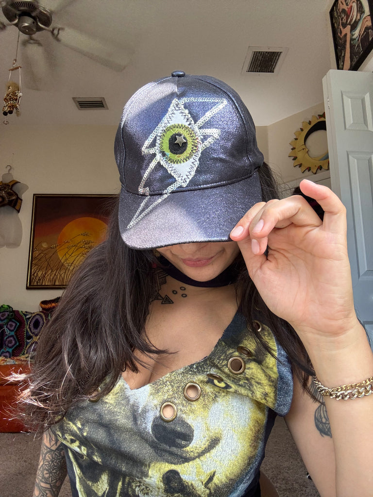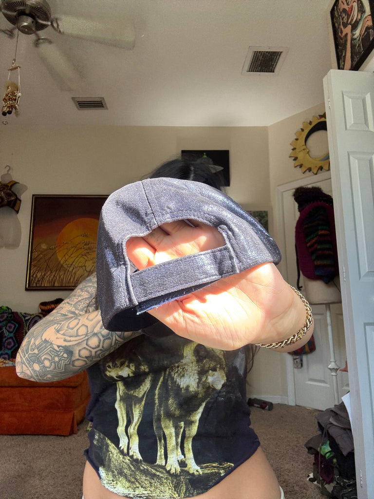 Blue shimmery brimmed hat with a Velcro adjustable strap and a sequined lighting strike