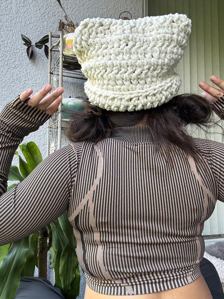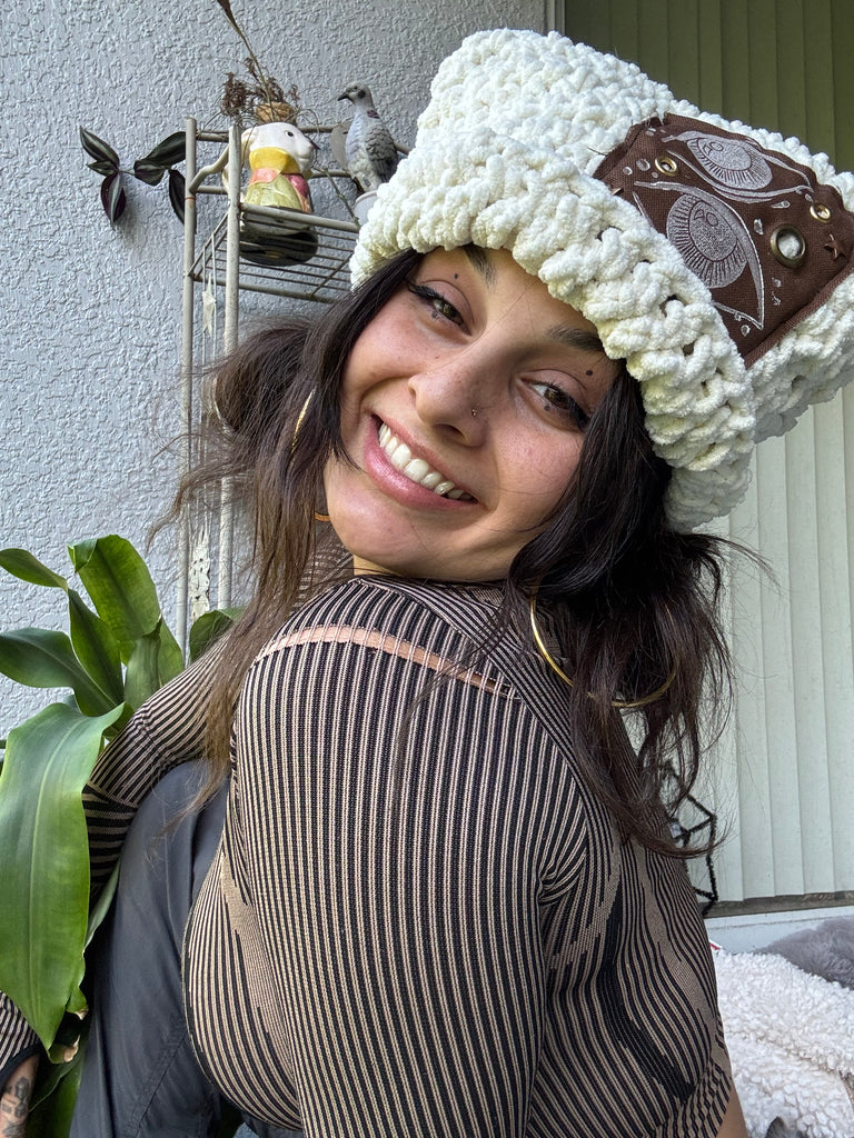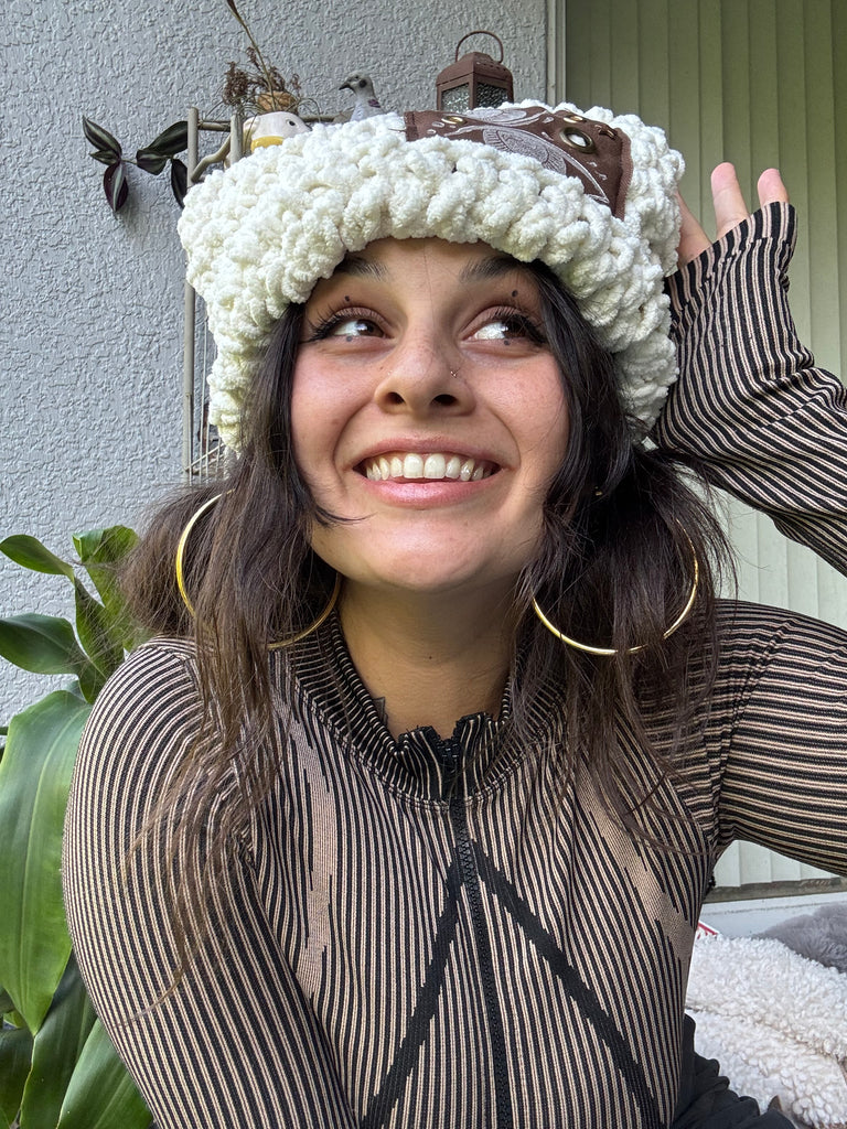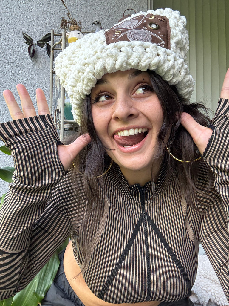 Thick n chunky crochet SQUARE beanie featuring a 1/1 block printed eyeball patch complete with shiny grommets and star studs ⭐️