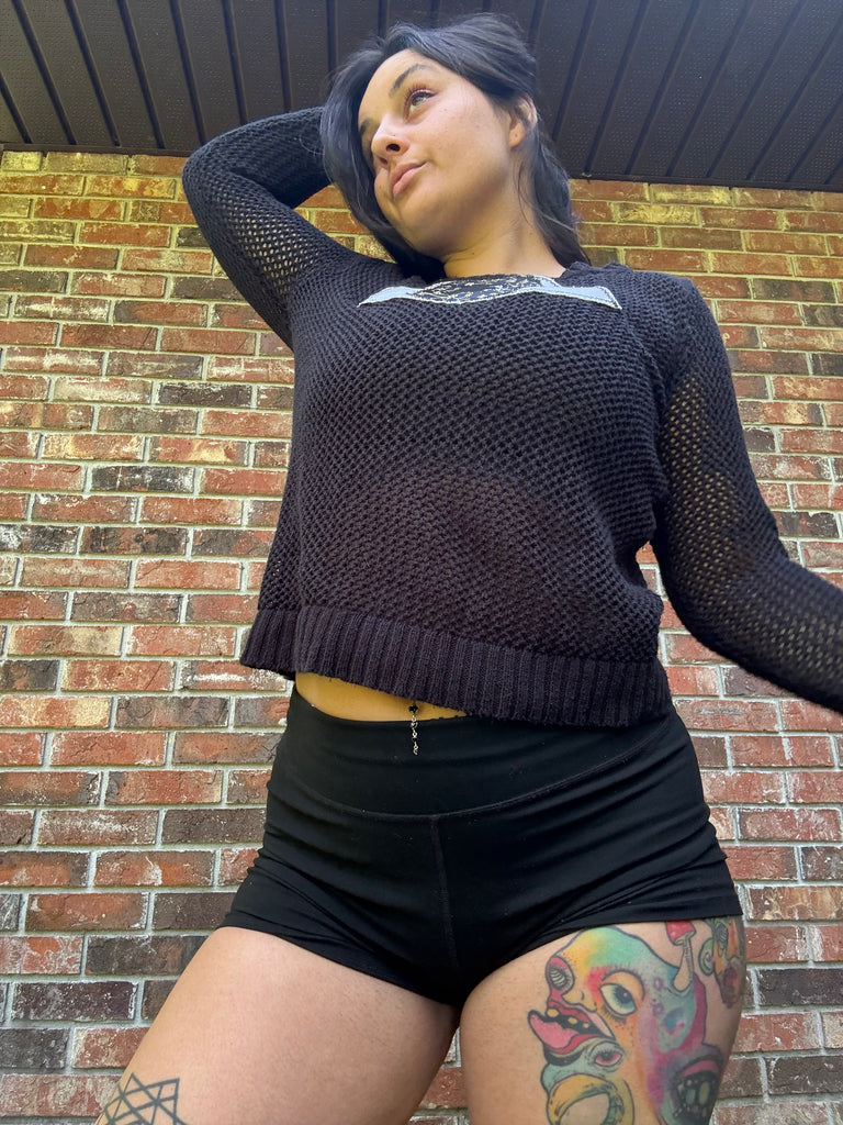 upcycled black knit sweater (cotton and acrylic blend) featuring an eye patch on the front chest