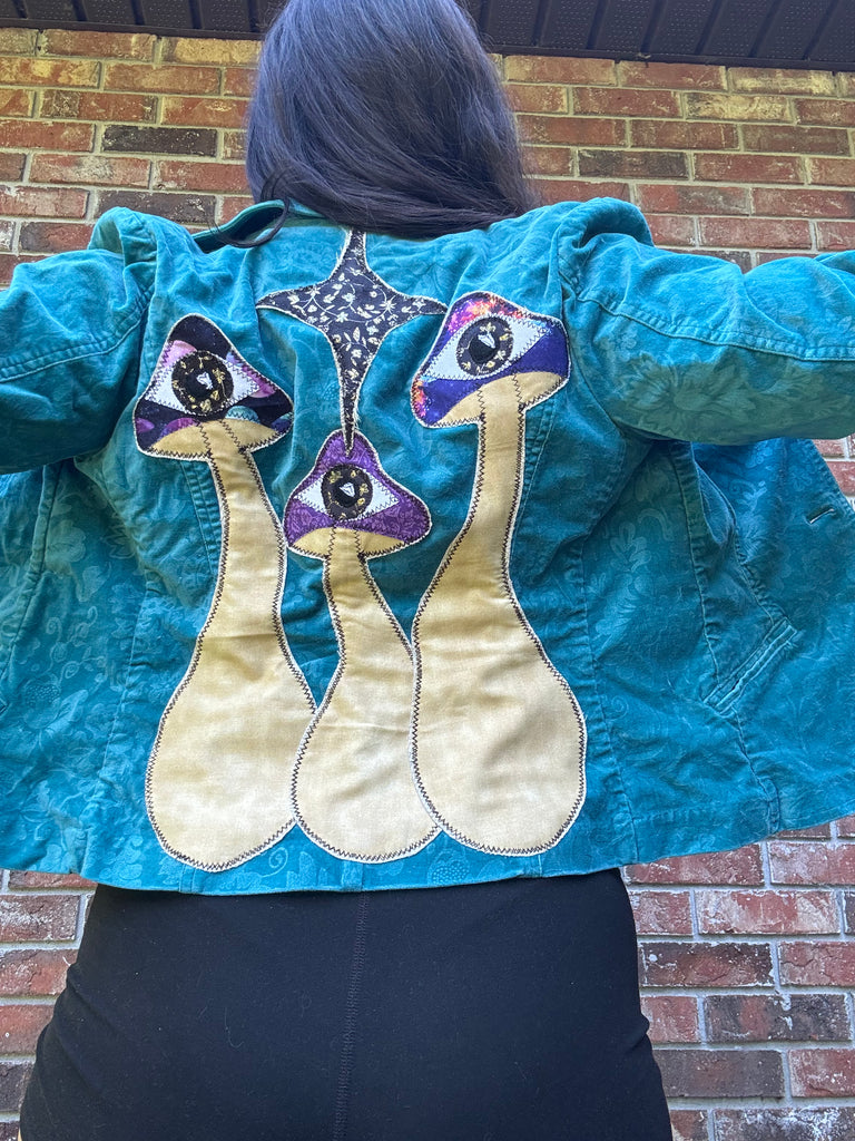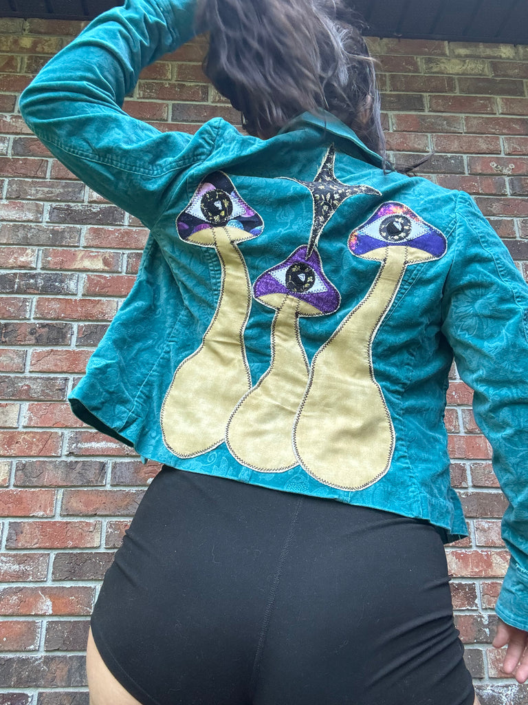 Floral printed velvet jacket! I replaced the button with a vintage metal one and added mushroom patches to the back with a sparkle North Star to lead the way✨